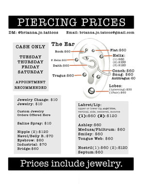 Alongside tattooing, Brianna offers piercing services. Booking an appointment is recommended for a guaranteed time. Walk-ins are accepted depending on Brianna's availability. Cash only.